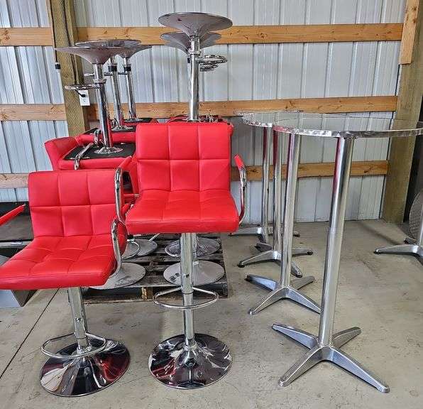 LOT 123 - (4) Aluminum Bistro Tables 23"×44", (14) Adjustable Height Swivel Chairs