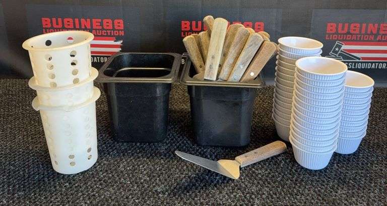LOT 322w - (23) Spatulas, (38) Sauce Cups, (2) Food Pans, (3) Utensil Holders