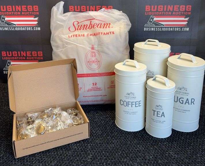 LOT 235q - Sunbeam Heated Blanket, (30) Drawer Knobs, (4) Canisters