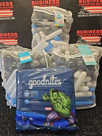 LOT 114o - (6) Bags HEOPEIS Ball Pit Balls, (1) Pack Diapers