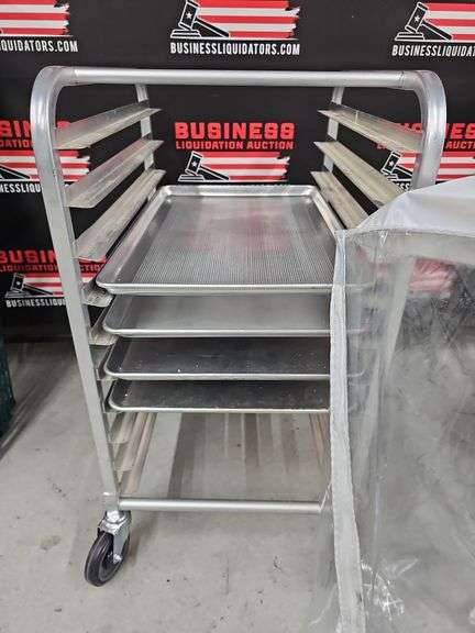 LOT 128 - WINCO 10 Full Size Pan Rolling Rack with Cover and (1) False Bottom and (3) Full Size Pans