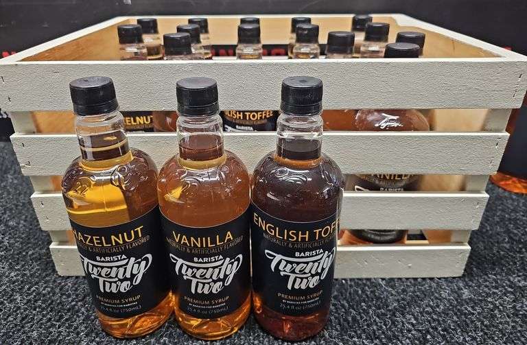 LOT 148d - BARISTA Twenty Two Premium Syrup, (6) Hazelnut, (6) Vanilla, (5) English Toffee. 25.4 oz