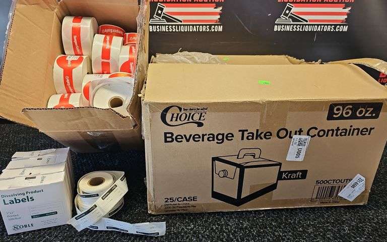 LOT 192z - Partial Case of Take Out Containers, Tamper Safe Stickers, Product Lables