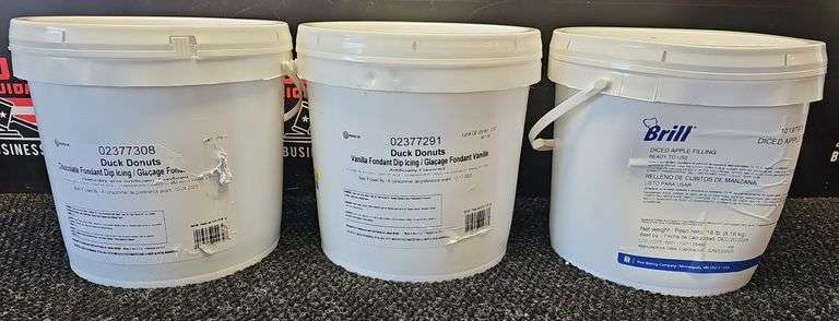 LOT 226x - 24 lb Vanilla Fondant Dip Icing, 18 lb Diced Apple Filling, 24 lb Chocolate Fondant Dip Icing